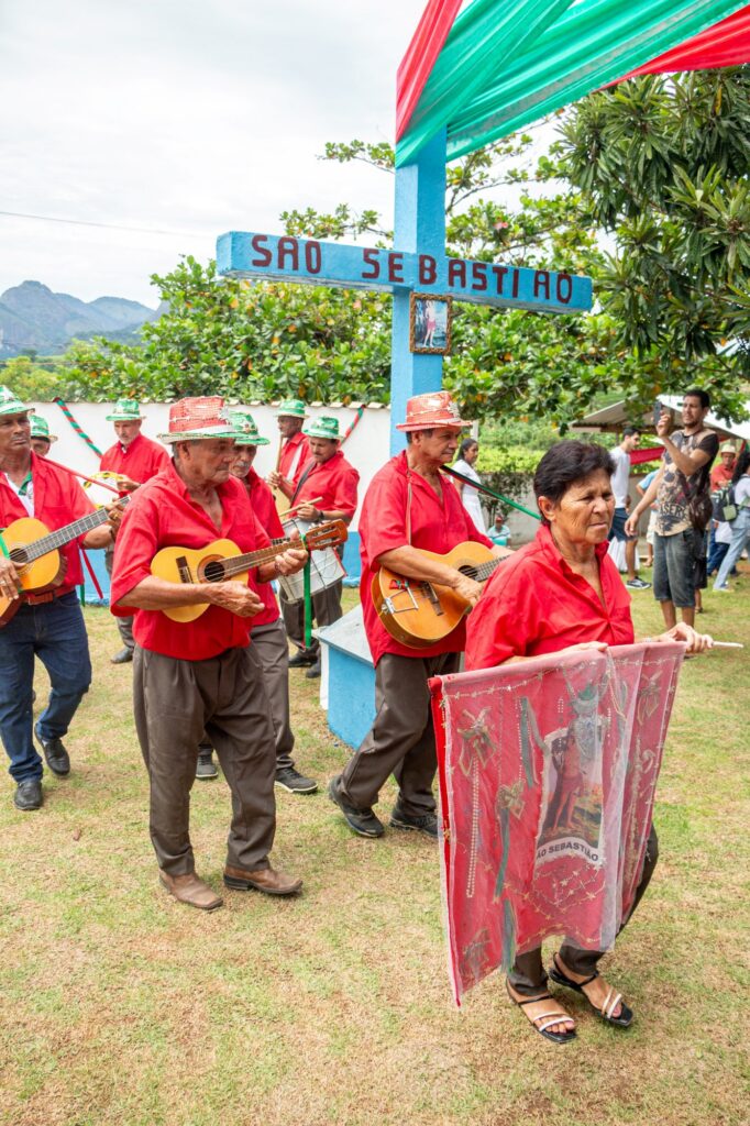 A Charola tem 16 componentes: mestre, contramestre, bandeireiro, foliões e as dançarinas – todos considerados “soldados” de São Sebastião. Cada elemento desempenha uma função diferente. Cabe ao mestre dirigir o grupo e conduzir as toadas por meio do apito. O contramestre assume o lugar do mestre quando este, por alguma razão, é impedido de atuar. O bandeireiro tem como função conduzir a bandeira à frente do cortejo. Os foliões tocam instrumentos musicais, enquanto as dançarinas repetem passos coreografados no meio da roda.