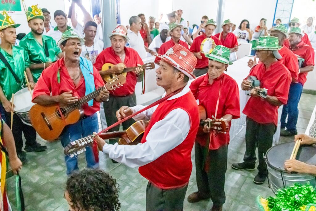 No começo eram apenas os foliões. As quatro dançarinas foram introduzidas no final dos anos 1970. “Fomos cantar em Anutiba e havia um grupo de moças estudantes que acompanhou o grupo. Foi numa festa. Gostamos da ideia”, lembra Izaías Quirino da Silva, mestre do grupo. Desde então há dançarinas no grupo, variando de quatro a cinco, sempre da família Quirino.